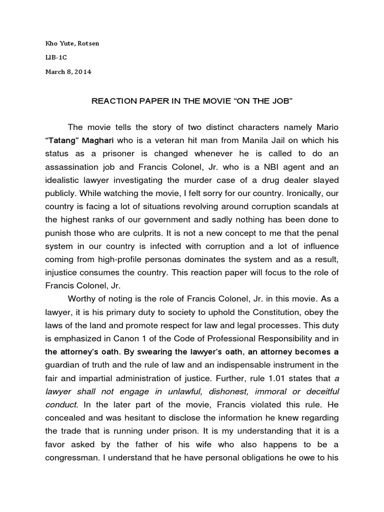 history baler reaction paper | Philippines from imgv2-1-f.scribdassets.com Treat the film as literature in an english class. How do you write a good reflection? Often, movies as used as tools that provide. Writing a reflection paper on a movie. Reaction essays to a movie may also appear like a journal entry because it presents an author's personal reaction as opposed to making an attempting to offer detailed analysis or with the right guidelines on how to write a reaction paper to a movie, you are guaranteed of a successful paper. Do you know how to write a reaction paper to a movie? Write what you feel and how you reacted or, int the case that this is for a survey regarding more than a few people. Stick to a common format.